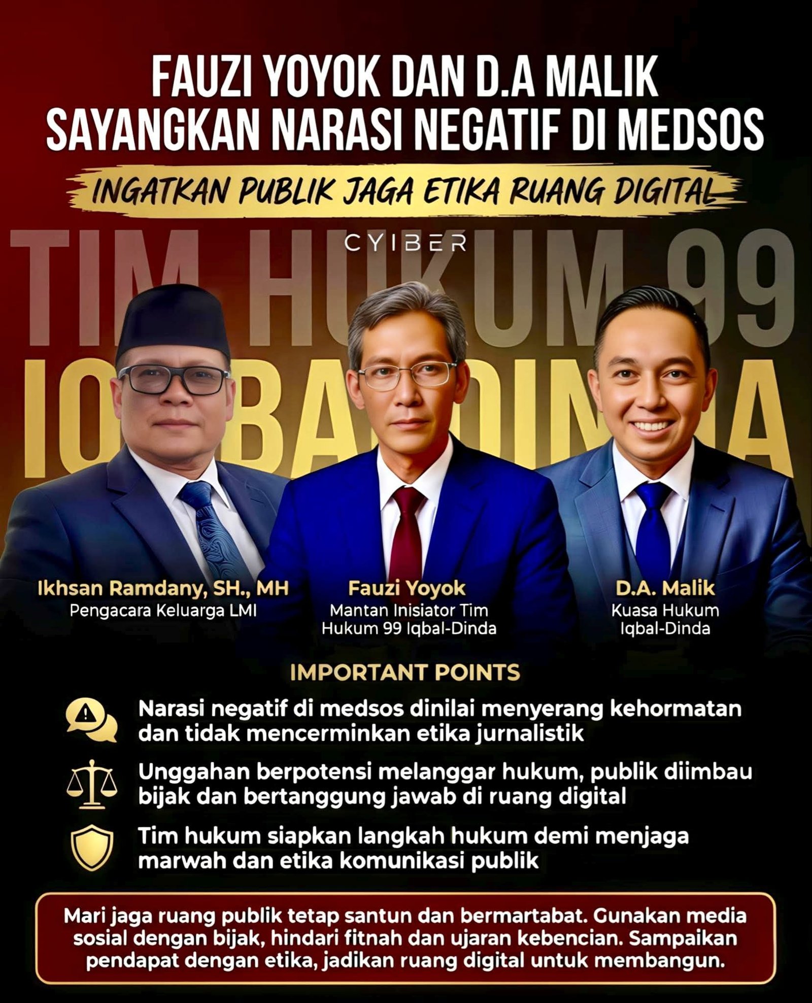 jejakmedianews.ID—ย Mantan inisiator Tim Hukum 99 Iqbalโ€“Dinda, Fauzi Yoyok, mengimbau seluruh pihak agar lebih bijak dalam membangun narasi di ruang publik, khususnya di media sosial. Imbauan ini disampaikan setelah muncul unggahan dari sebuah akun Facebook yang diduga milik media Pusaranntb, yang memuat pernyataan bernada negatif dan dinilai menyerang kehormatan pribadi.