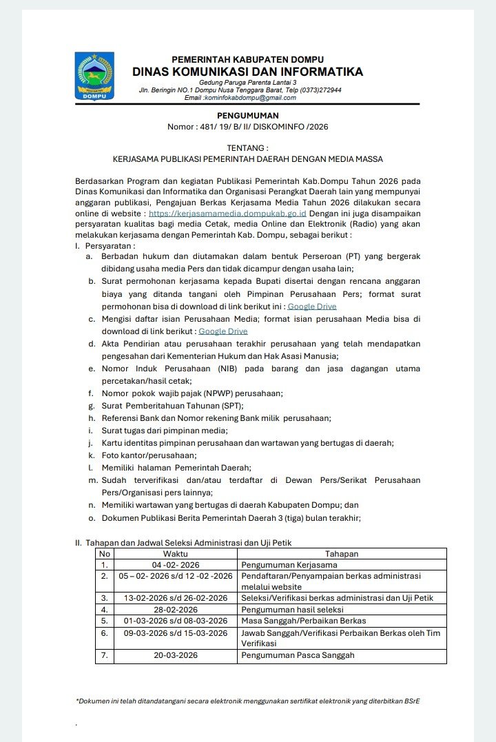 Dompu, JEJAKMEDIAnews –Pemerintah Kabupaten Dompu melalui Dinas Komunikasi dan Informatika (Diskominfo) melakukan pembaruan syarat-syarat alur kerja sama media partner yang wajib dipenuhi. Kali ini, Diskominfo akan lebih selektif dalam mengatur kerja sama media partner di tahun 2026.
