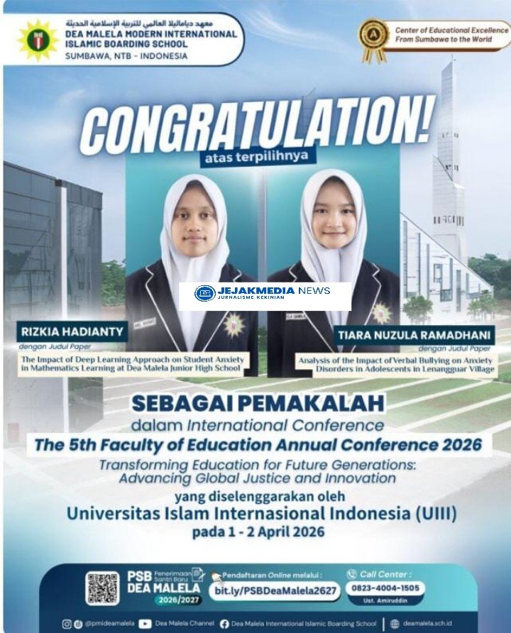 jejakmedianews.ID– Dua Santriwati sebuah Ponpes Moderen yang bernama Dea Malela binaan Professor Din Syamsuddin yang bermarkas di Sumbawa Besar kembali menorehkan Prestasi Internasional membanggakan kembali diukir oleh Rizkia Hadianty dan Tiara Nuzula Ramadhani, terpilih menjadi pemakalah dalam ajang bergengsi The 5th Faculty of Education Annual Conference 2026.