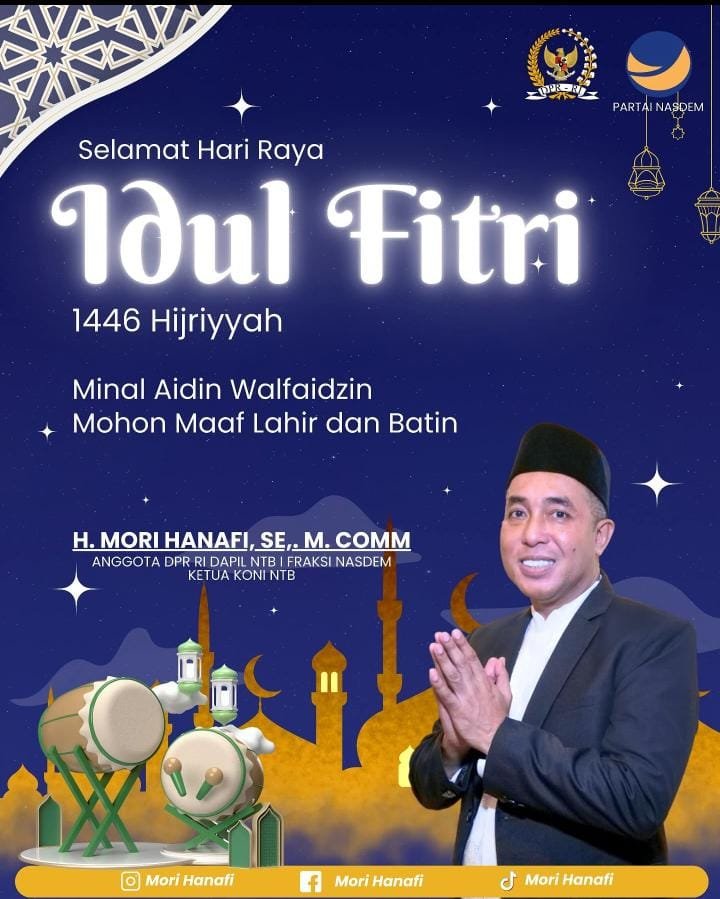 jejakmedianews.ID|Anggota DPR RI Fraksi Nasdem Dapil Nusa Tenggara Barat (NTB) 1, Ketua KONI Nusa Tenggara Barat (NTB), H. Mori Hanafi, SE., M.COMM, mengucapkan Selamat Hari Raya Idul Fitri 1447 H, seraya mengajak masyarakat menjadikan momen ini untuk meningkatkan ketaqwaan, kebahagiaan, dan mempererat silaturahmi.