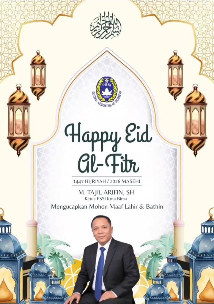jejakmedianews.ID– Ketua Umum Asosiasi Provinsi (Asprov) PSSI Kota Bima, M.Tajil Arifin, SH., mengucapkan selamat Hari Raya Idulfitri 1447 H / 2026 M kepada seluruh pengurus, klub anggota, suporter, dan masyarakat pencinta sepak bola.