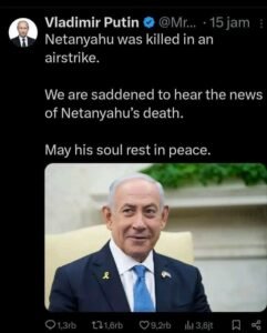 Presiden Rusia Vlamidir Putin tak ketinggalan menyebarkan berita yang menggemparkan dunia ini, dalam akun media sosial mengonfirmasi bahwa Perdana Menteri Israel Benyamin Netahanyu tewas dalam serangan Rudal Iran.